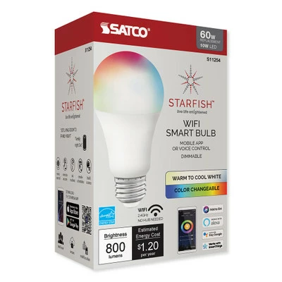 Control the color and intensity of your lights with the SATCO Starfish Wi-Fi 10W LED A19 RGB and Tunable White Smart Bulb. This Wi-Fi connected smart LED bulb features built-in color temperature adjustment and Dim/Brighten functionality to give you complete control over the lighting and atmosphere of your home. The 10W LED Bulb emits the same amount of light as a 60W incandescent bulb. The smart bulb directly connects to the Starfish Smart Lighting app via Wi-Fi, no smart hub required.