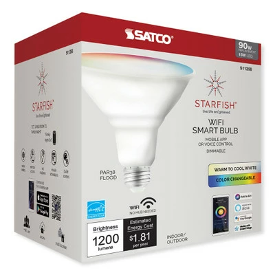 Control the warmth and intensity of your lights with the SATCO Starfish Wi-Fi 15W LED PAR38 RGB and Tunable White Flood Light. This Wi-Fi connected smart LED flood light features built-in color temperature adjustment and Dim/Brighten functionality to give you complete control over the lighting and atmosphere of your home and outside property. The 15W LED Bulb emits the same amount of light as a 90W incandescent bulb. The smart bulb directly connects to the Starfish Smart Lighting app via Wi-Fi, no smart hub required.