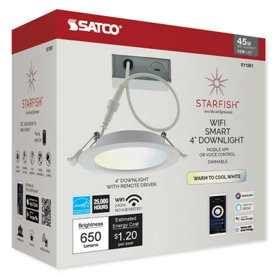Control the warmth and intensity of your lights with the SATCO Starfish Wi-Fi 4″ LED Tunable White Edge-Lit Remote Driver Downlight. This Wi-Fi connected smart LED bulb features built-in color temperature adjustment and Dim/Brighten functionality to give you complete control over the lighting and atmosphere of your home and outside property. The 10W LED Bulb emits the same amount of light as a 45W incandescent bulb. The smart bulb directly connects to the Starfish Smart Lighting app via Wi-Fi, no smart hub required.